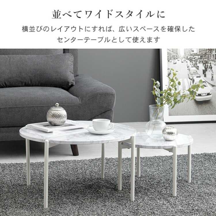 本商品は大きさが異なる大小のテーブルが2つセットになっています。2つのテーブルを横に並べることで、広いスペースを確保したセンターテーブルとしてお使いいただけます。また、テーブルを並べるだけでなく、一つはリビングに、もう一つは寝室にと別々のお部屋や場所で使用することもできます。作業やコップを置いてテーブルとして使用するのはもちろん、お気に入りのインテリアや観葉植物を置いてディスプレイ台として使用するのもおすすめです。