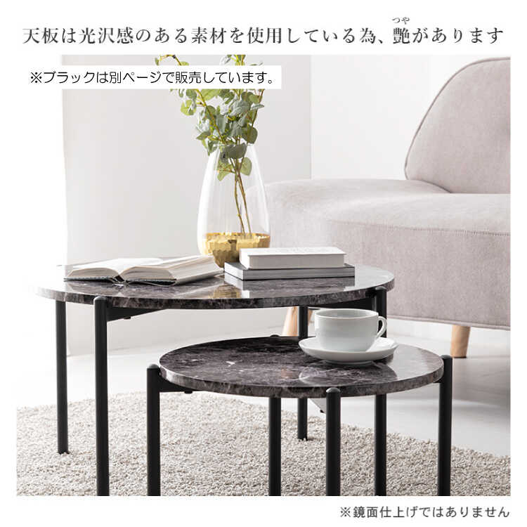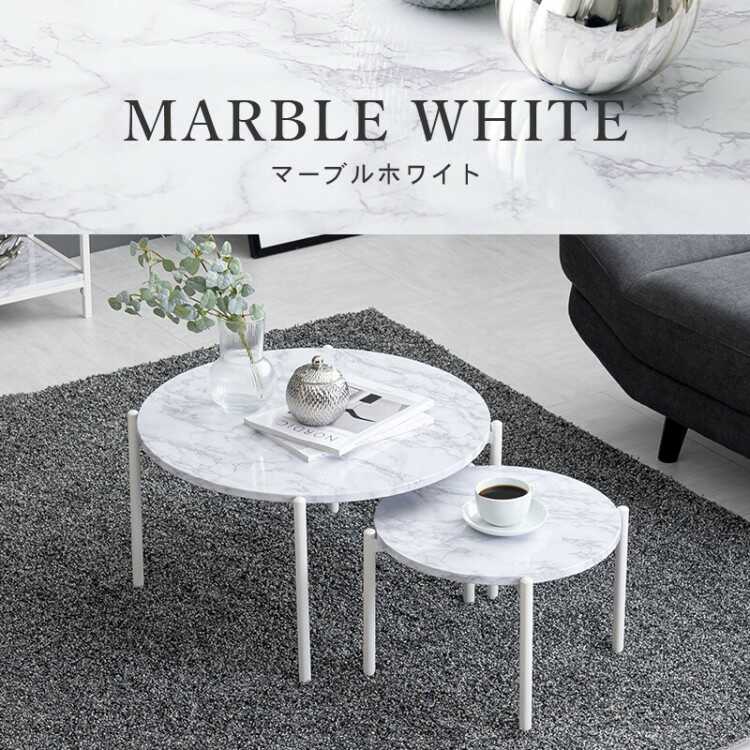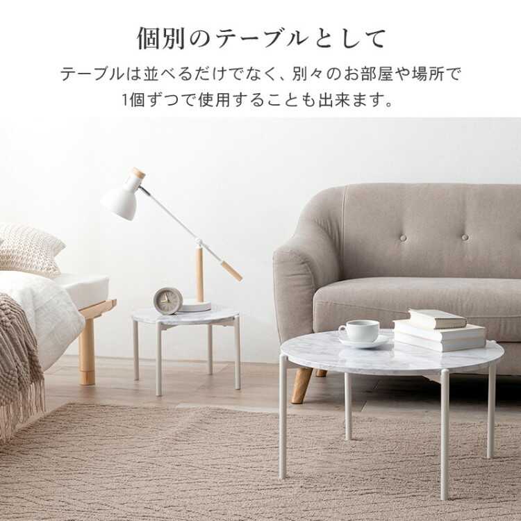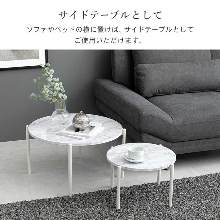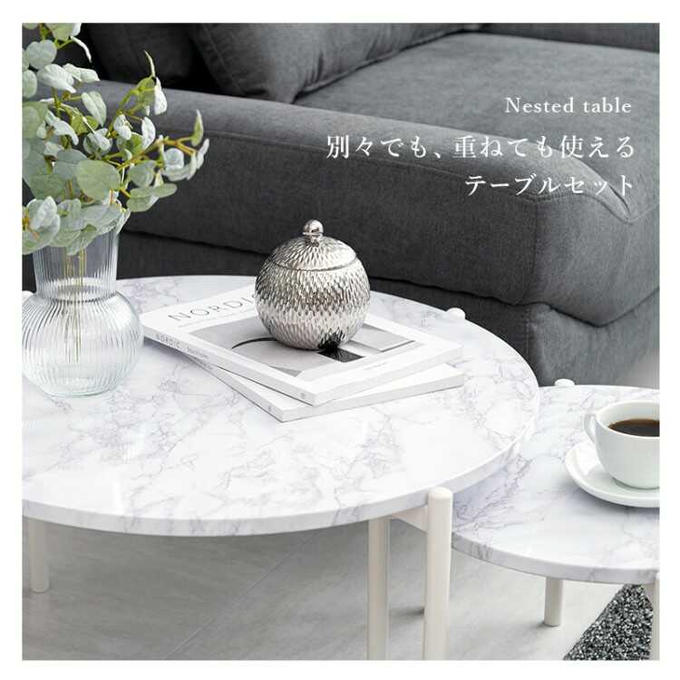 別々でも重ねても使える、大理石柄の丸円形ツインテーブル。直径64cmの大テーブルと直径44cmの小テーブルが2個セットになったお得なアイテム。横に並べてゆったり使えるリビングテーブルとして使用したり、ソファやベッド横に置いてサイドテーブルとして使用、さらに別々のお部屋や場所で1個ずつ使用したりと生活やシーンに応じて様々な使い方が可能です。