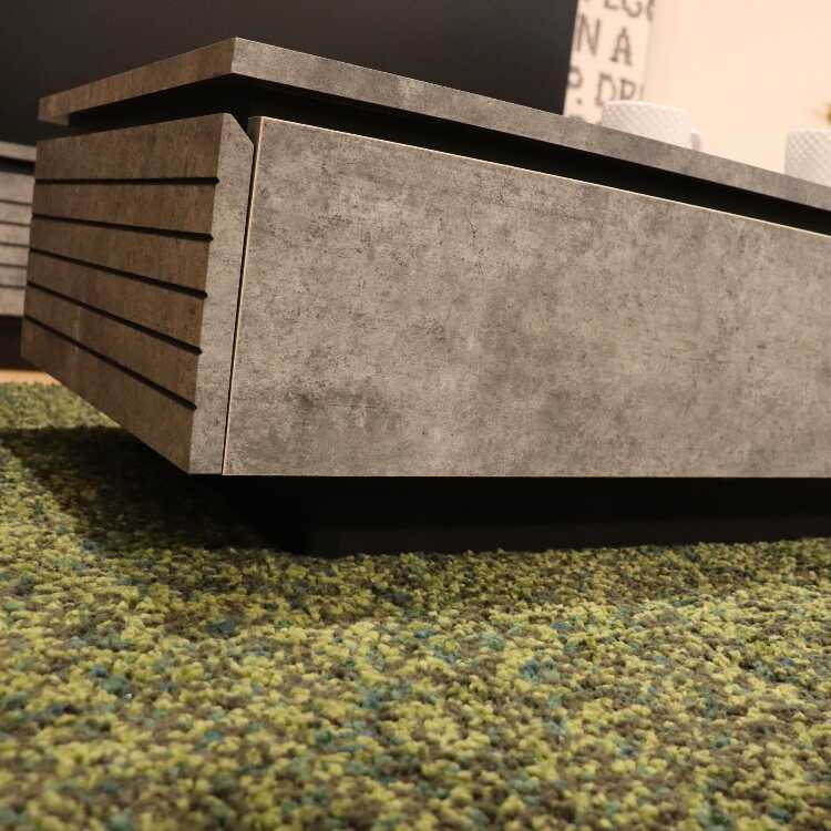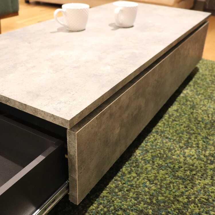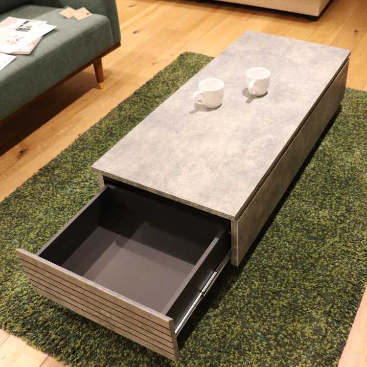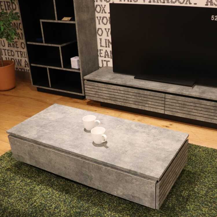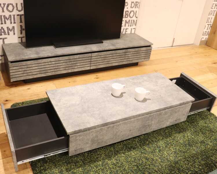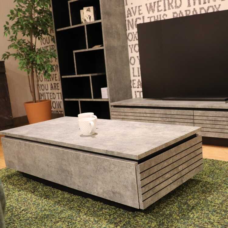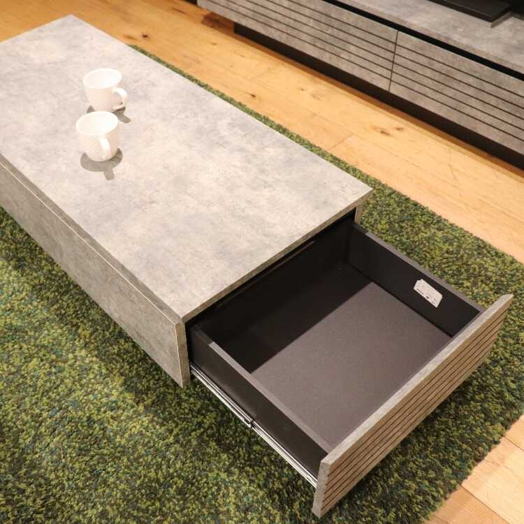 精度の高いコンクリート・ストーン柄と、迫力のサイズ設計、大容量の収納力と魅力が詰まった秀作ローテーブル。