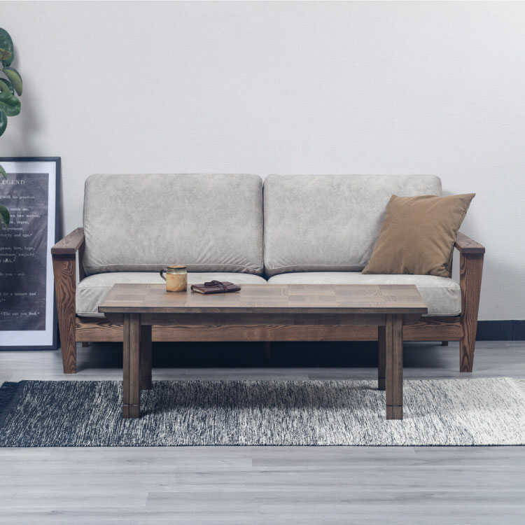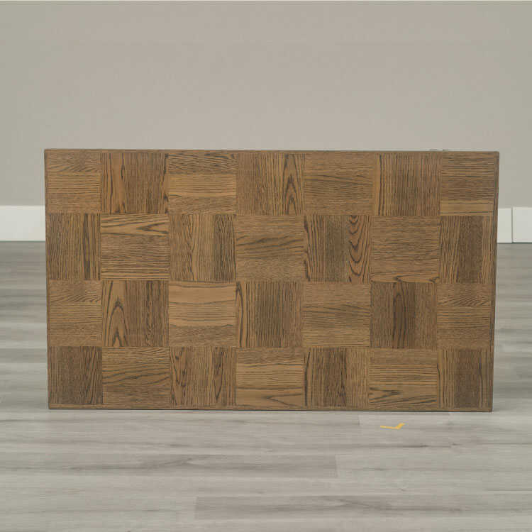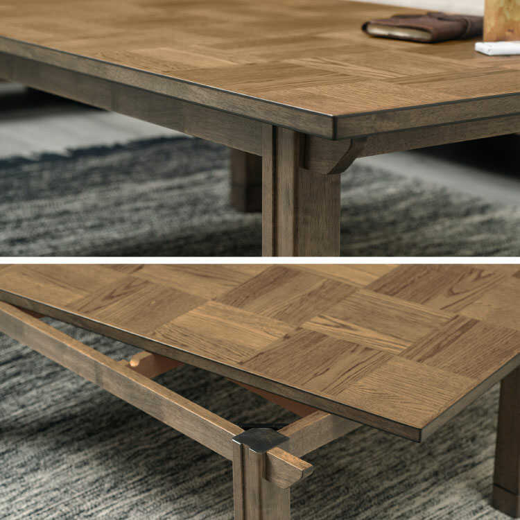 天板は高級木材である天然木オークを使用し、正方形を木目の向きを縦横交互にブロック状に並べた個性的なデザインです。