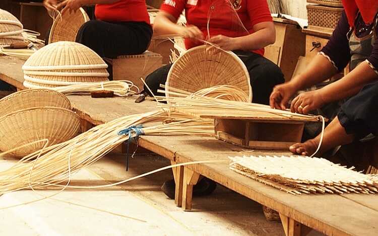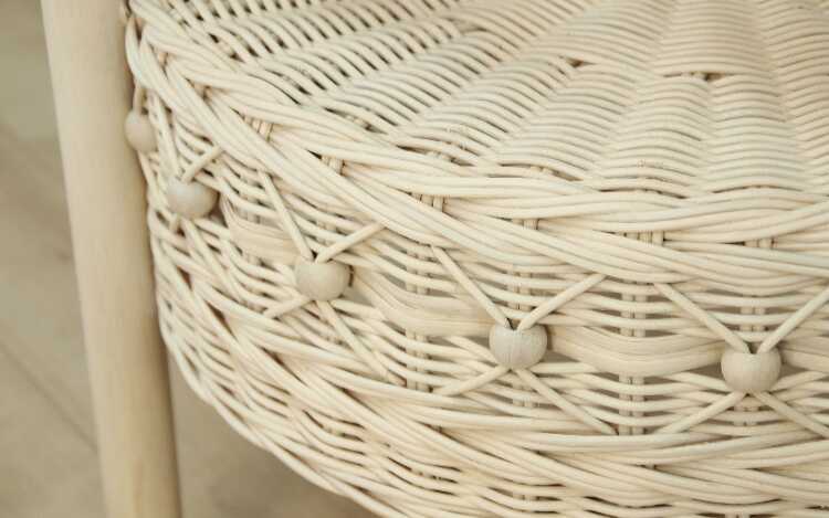 熟練の職人が一つ一つ手編みしており、天板のフチや収納部分など編み方を変えることで細部までこだわりを感じさせます。