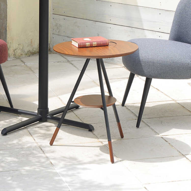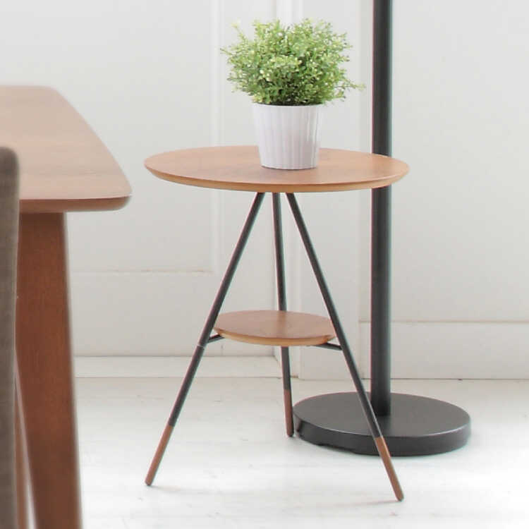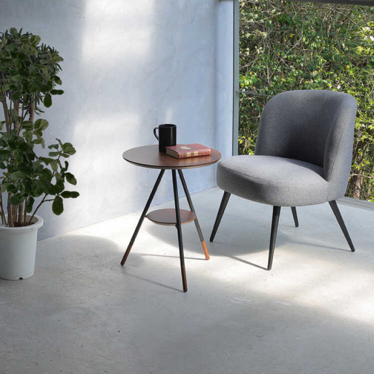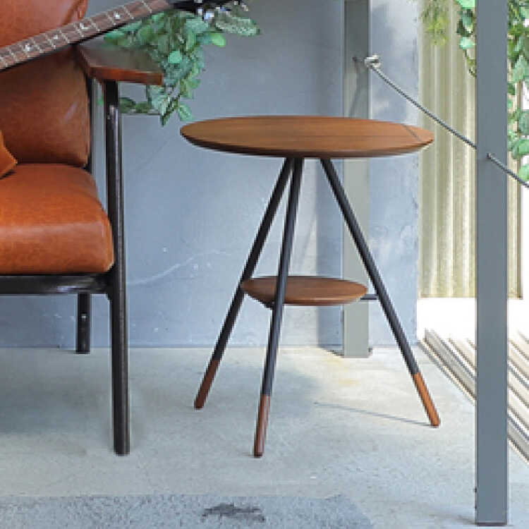 おしゃれな円形サイドテーブルはウォールナットの突板天板とスチールを組み合わせた北欧モダンな仕上がり。