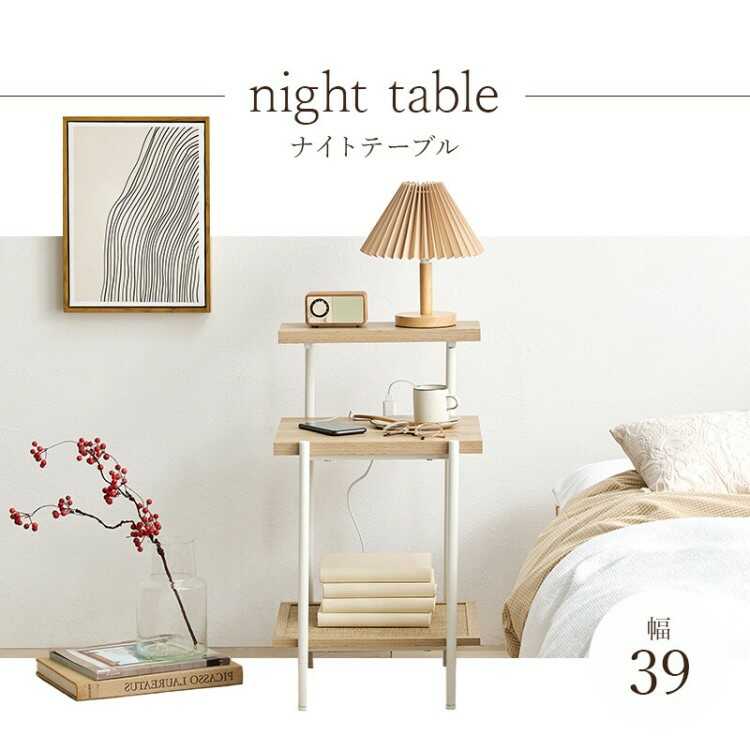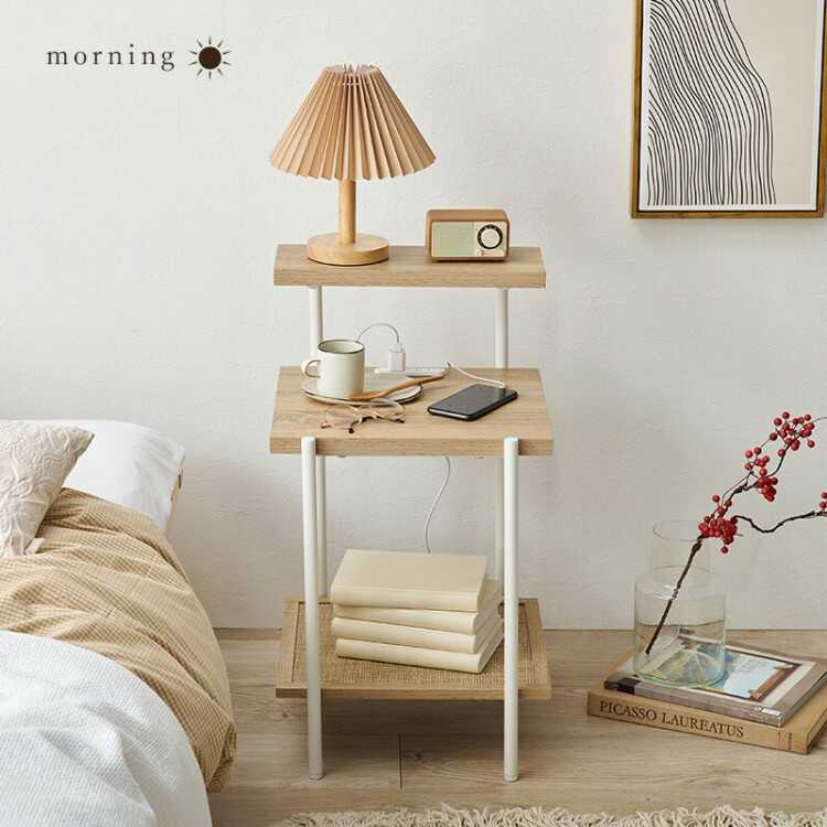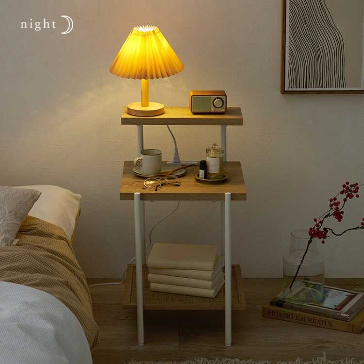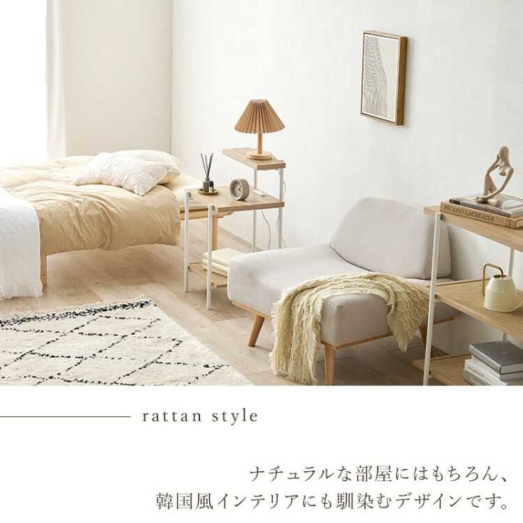 家中どこでも活躍!電源コンセント付きのラタン調サイドテーブル。幅39cm×奥行39cmと場所を取らないコンパクトサイズなので、ソファ横のサイドテーブルやベッド横のナイトテーブルなど様々な場所で活躍します。上段・中段の棚板は温かみのある木目調、下段は涼し気なラタン調でこなれ感を演出してくれます。さらに、中段には2口コンセントが付いているので、スマホの充電やデスクライトなどを置いていただけます。