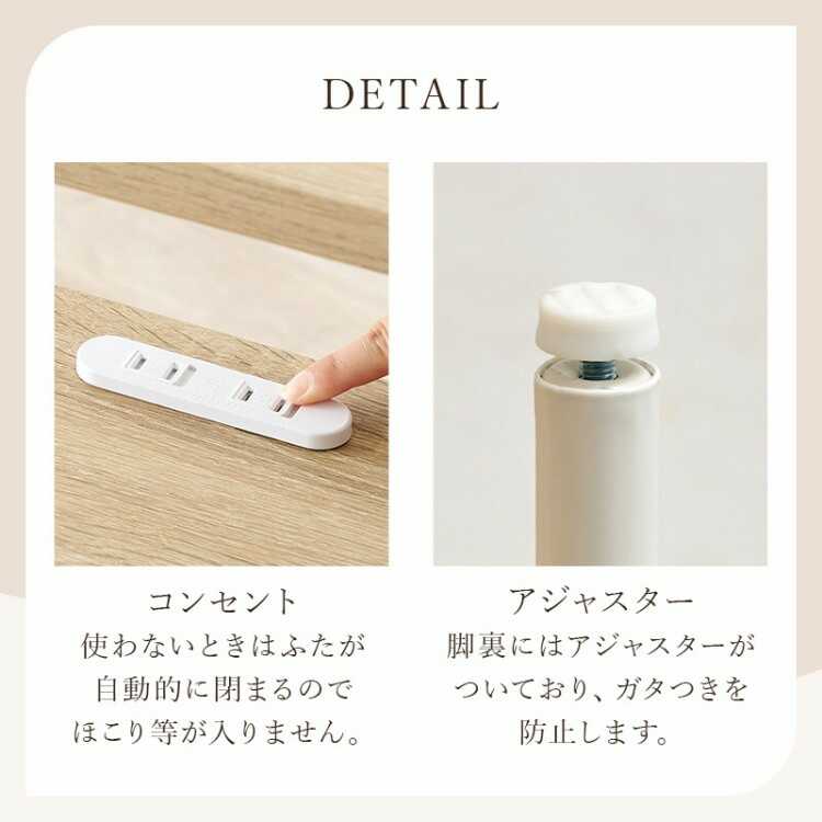 上段・中段の天板はナチュラル色の優しい木目調デザイン。本物の天然木を使用したような風合いがあり、北欧やナチュラル、韓国風インテリアにも馴染みます。天板をよく見ると木材をカットしたようなノコギリ跡まで再現されており、細部までこだわりを感じさせます。上段は一番目立つのでお気に入りの小物をディスプレイするのに最適。中段は手を伸ばしやすい高さ設計なので、コップやメガネなど使用頻度の高い物を置くのにぴったり。さらに中段後方に配された2口コンセントは、使用しない際ふたが自動的に閉まるのでホコリ等が入りにくく安心です。