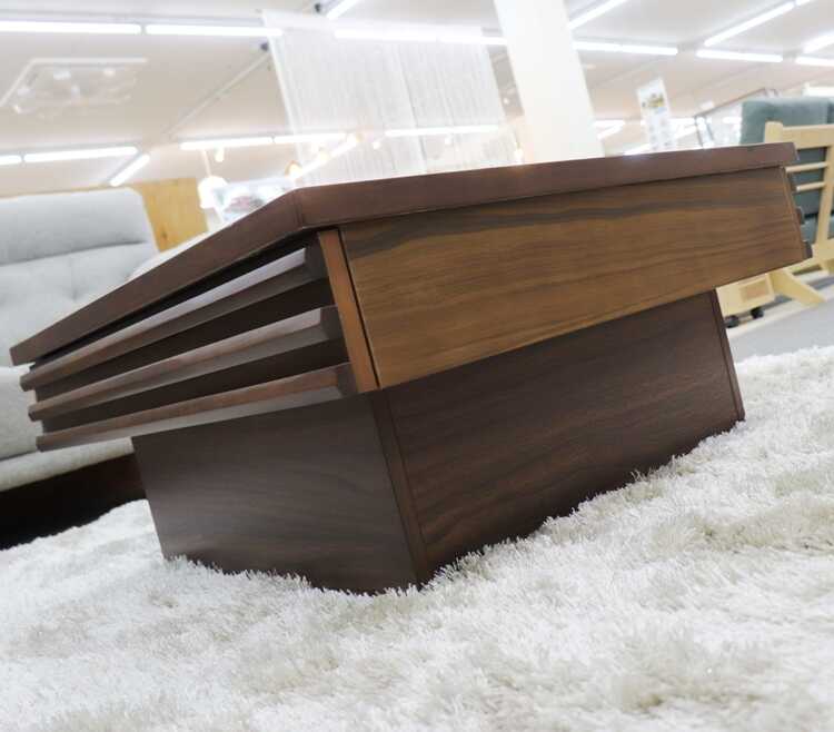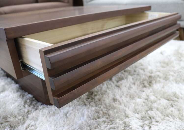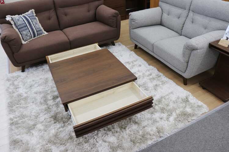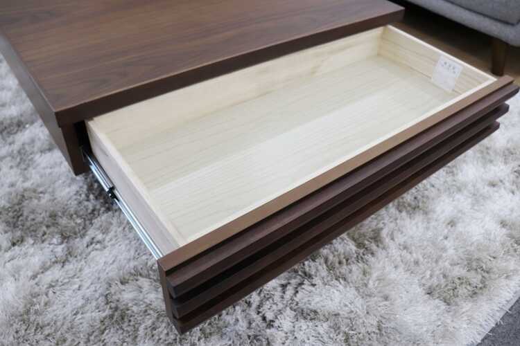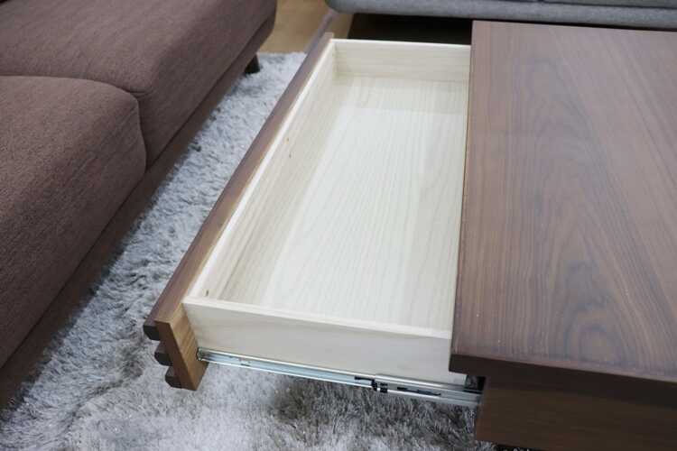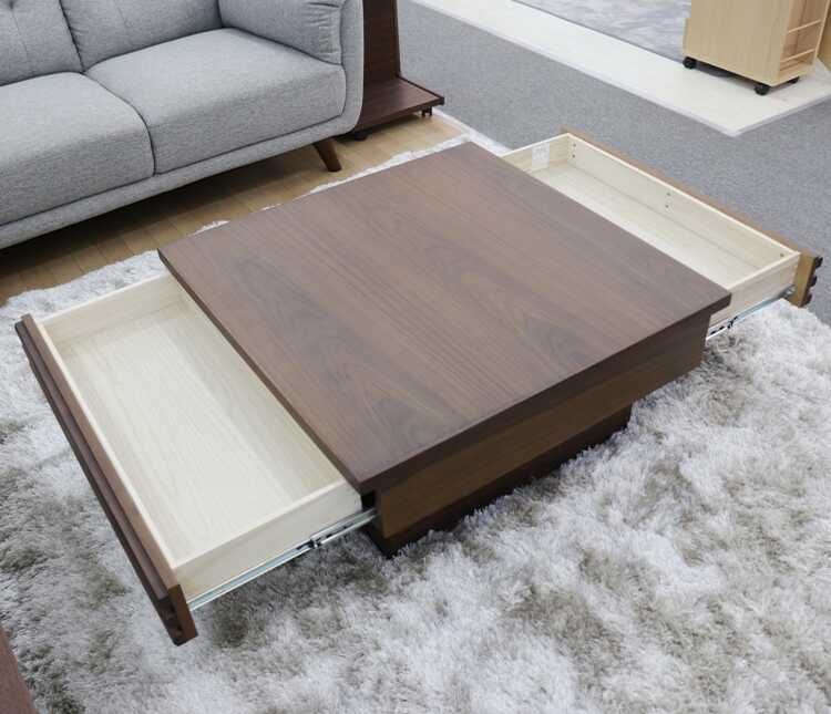 リビングで80cm四方の場所をとる大型のテーブルですが、そのスペースは無駄にしません。内部は収納スペースになっています。左右の両サイドに2杯の引き出しが付いているのでかなりの収納力があります。引出しは強靭なロッキング箱組仕様で、グレードの高い3段フルスライドレールを採用していますので、リッチな開閉感を得られます。