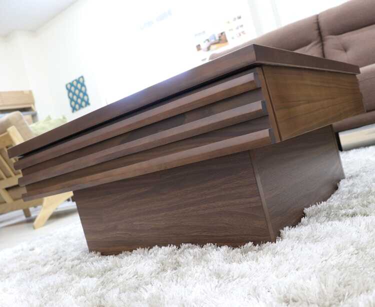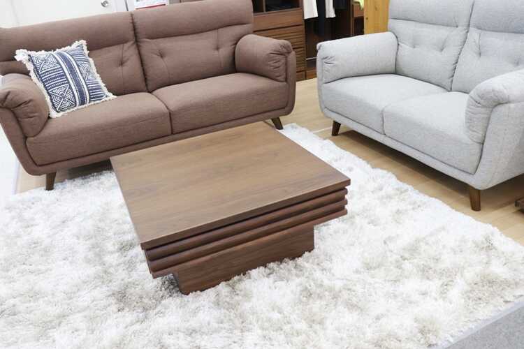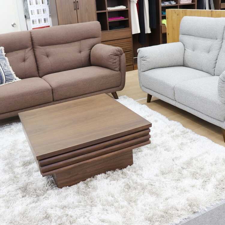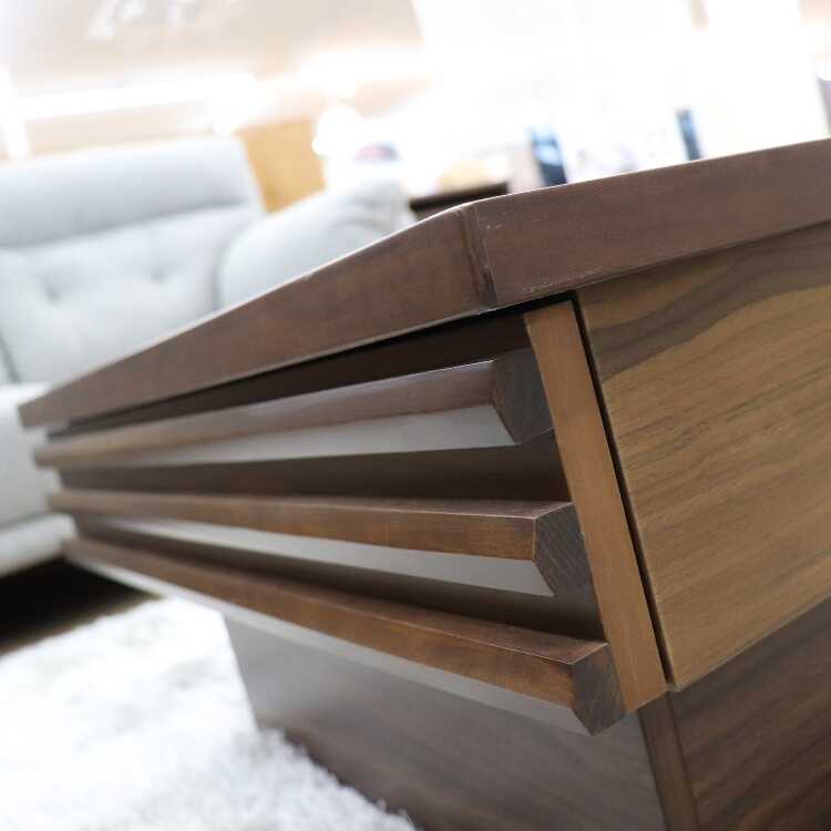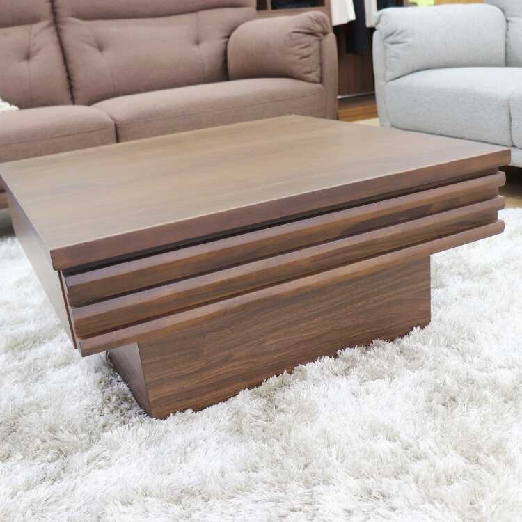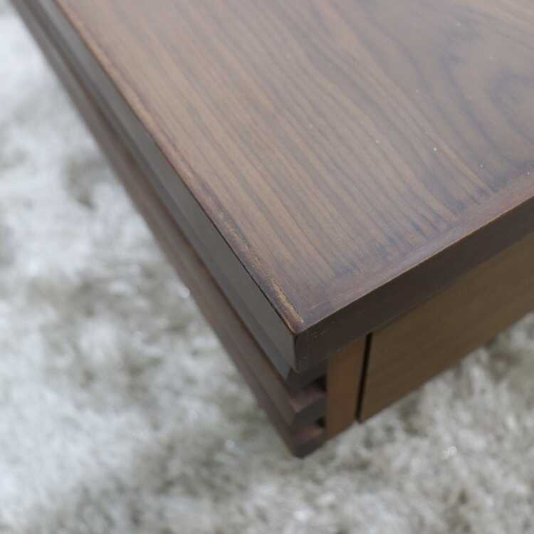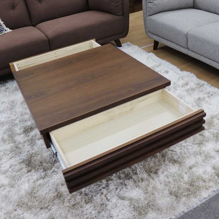 天板と前板に天然木突板を、引出しの前面の細工には天然木無垢材を使った高級リビングテーブル。広いリビングで圧倒的な存在感を放つ正方形の大型タイプです。落ち着いたウォールナットブラウンのカラーと上品な木目の表情が秀逸。完成品ならではの豪華な質感をお楽しみください。