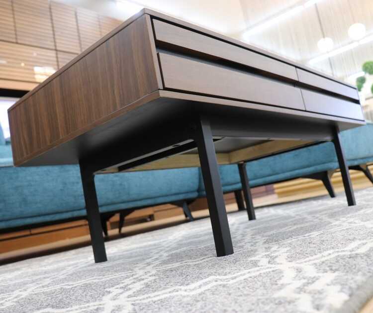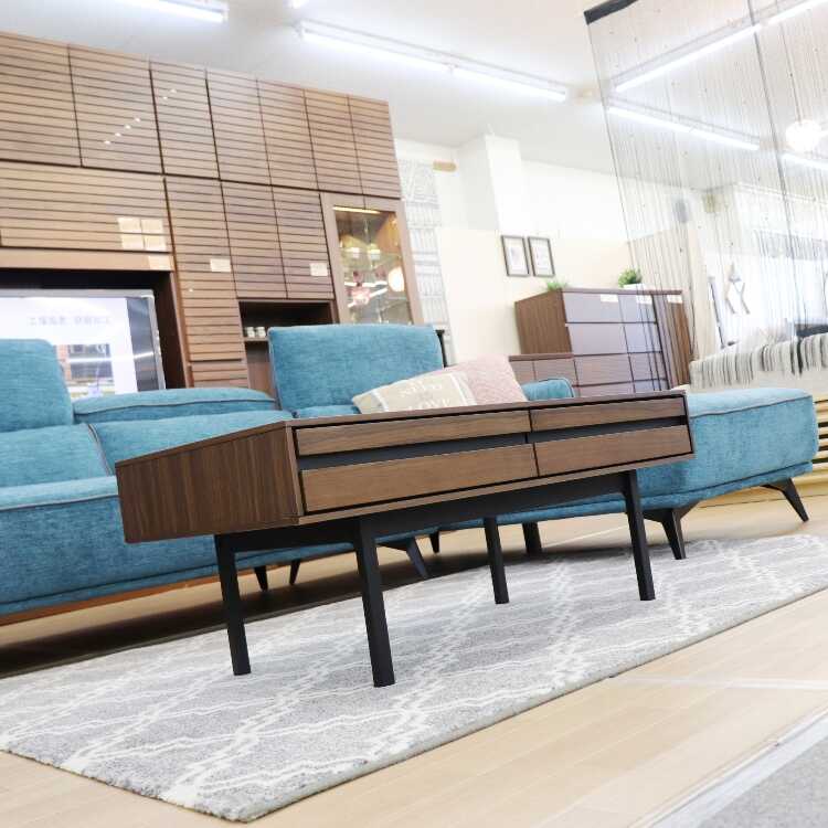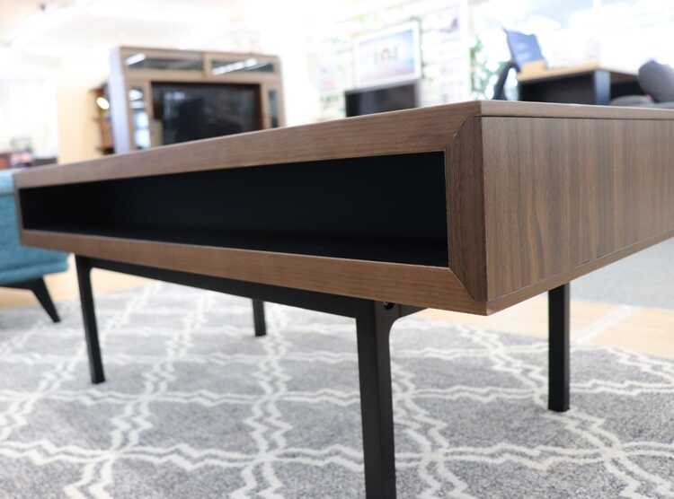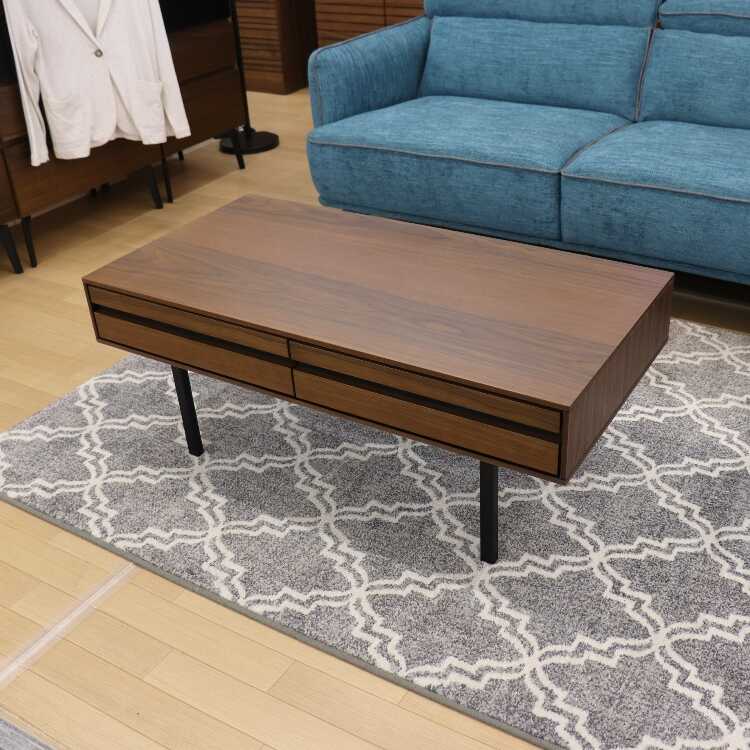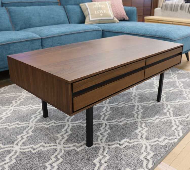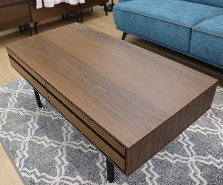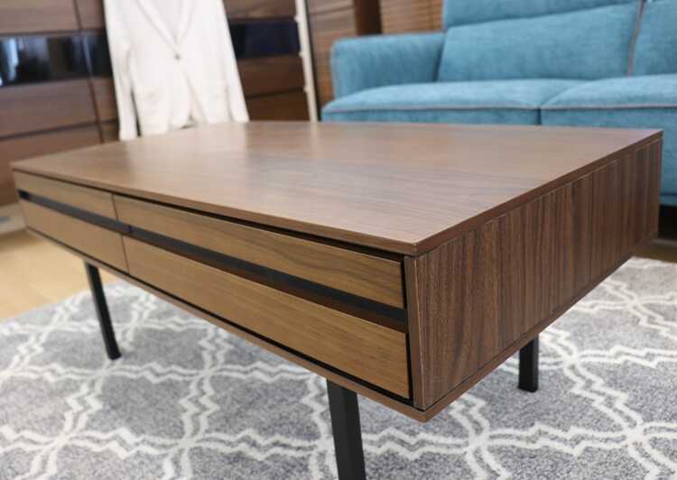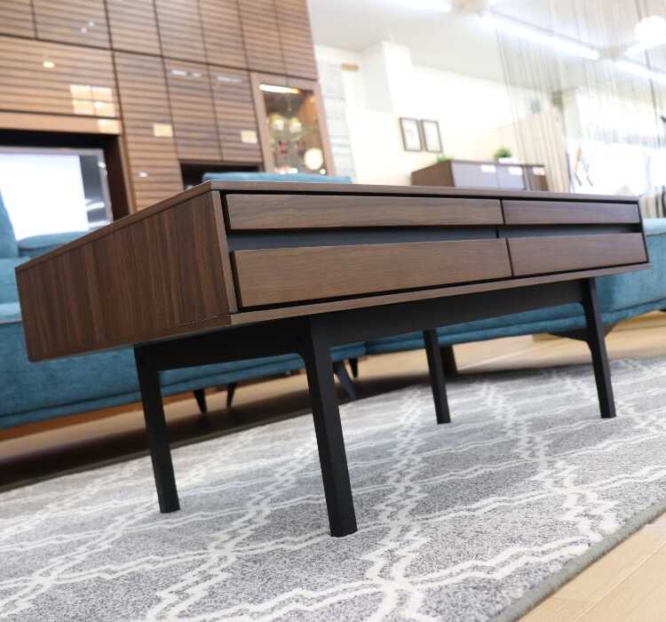 北欧からモダンまで既存の家具とも合わせやすく、リビング空間を上品に。ウォールナットブラウンを基調に引出し前板に引いたライン部分と脚にブラックを採用することでセンスの良いツートンカラーになっています。本体部分は完成品ですのでグレード感が高いテーブルです。