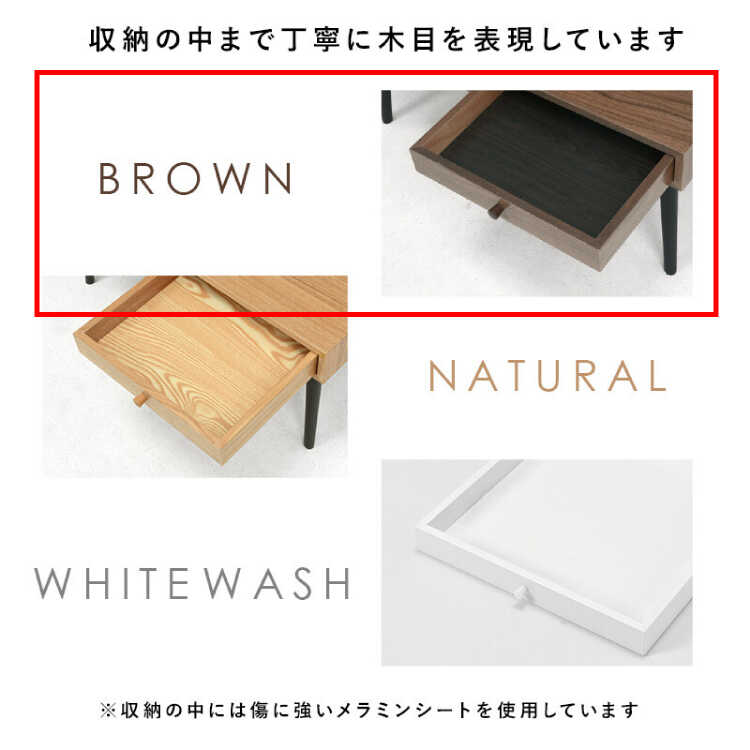 引き出しの内部はキズに強いメラミンシート貼り。収納の中まで丁寧に木目を表現しており手のこんだ仕様です。