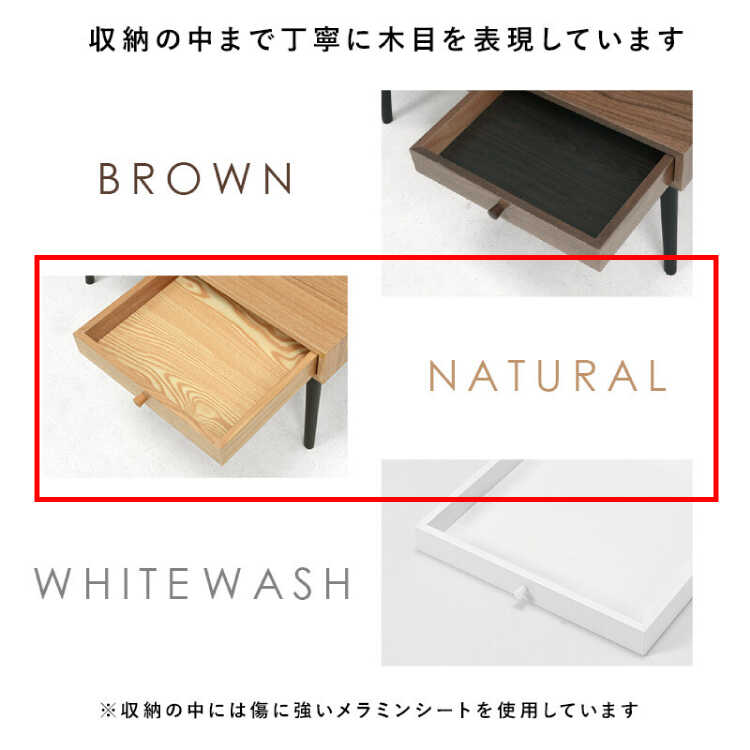 引出し収納付きタモ製センターテーブルのカラーはお部屋の雰囲気が明るくなるナチュラルカラー。