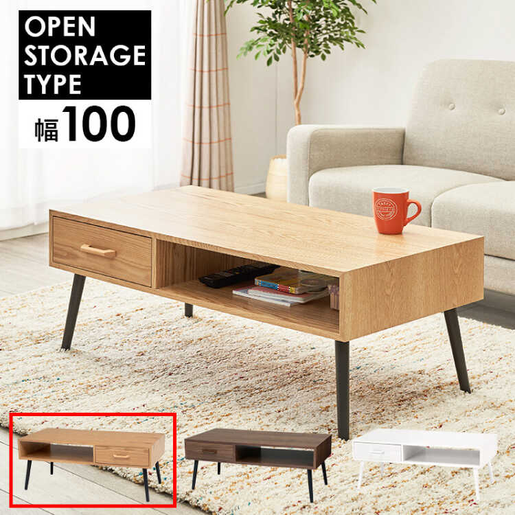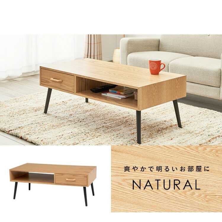 幅100cm・タモ製リビングテーブル(ナチュラル色/引出し付き)