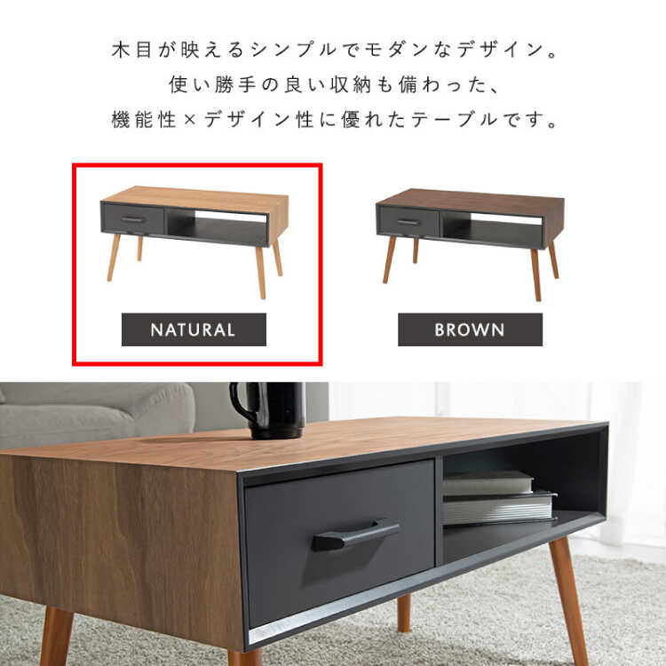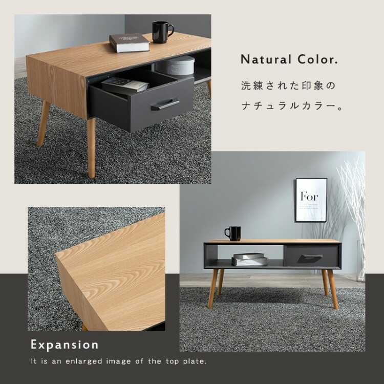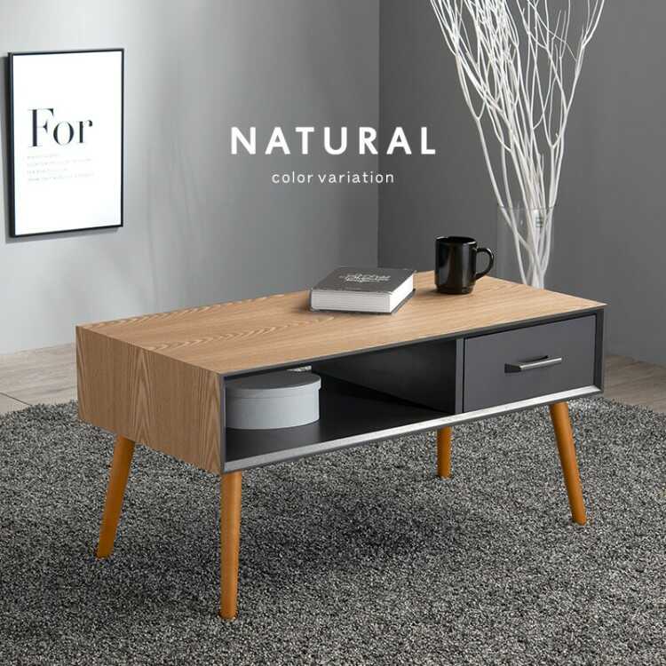 収納力が豊富なかっこいいローテーブルは、一見シンプルなデザインに見えますがナチュラルカラーとダークカラーのツートンがちよっとしたアクセントになって、程良い存在感を放ちます。