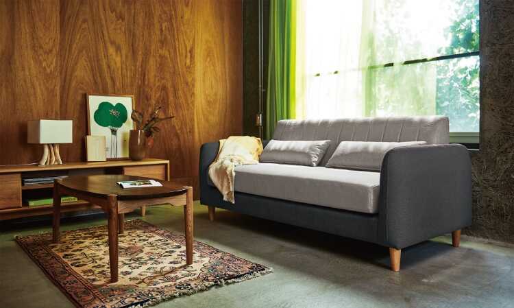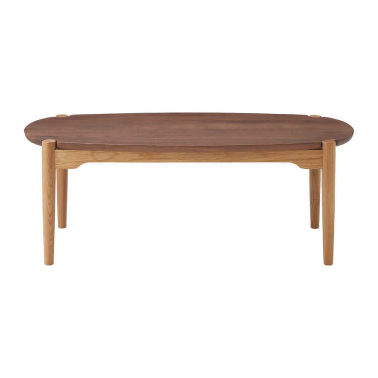 天然木ウォールナットとホワイトオーク無垢材を使用したツートンカラーがお洒落な高級ローテーブル。天板には高級木材といわれている木目が美しいウォールナットを贅沢に使用。脚には耐久性の高いホワイトオークを使用しています。天板の四隅は角を落としたようなデザインでお部屋の印象を優しくしてくれます。脚は天板まで伸びた珍しいデザインで、デザイナーさんの遊び心を感じられます。幅110cm×奥行52cmと小さすぎないので、ソファの前に置いたり、単体で軽食や作業テーブルに使ったりと様々なシーンで活躍します。