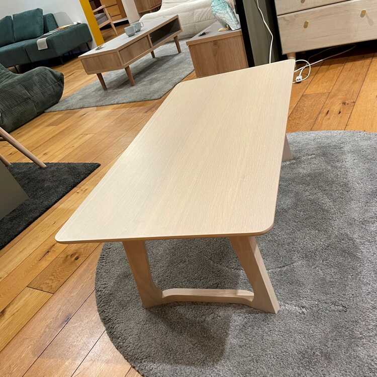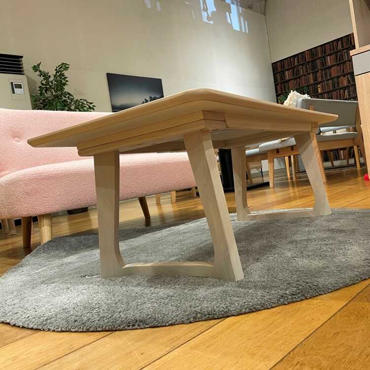 天板にはオーク突板、脚にはラバーウッドと2種類の天然木で作られたリビングテーブル。
