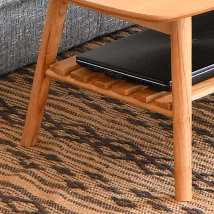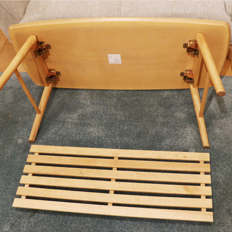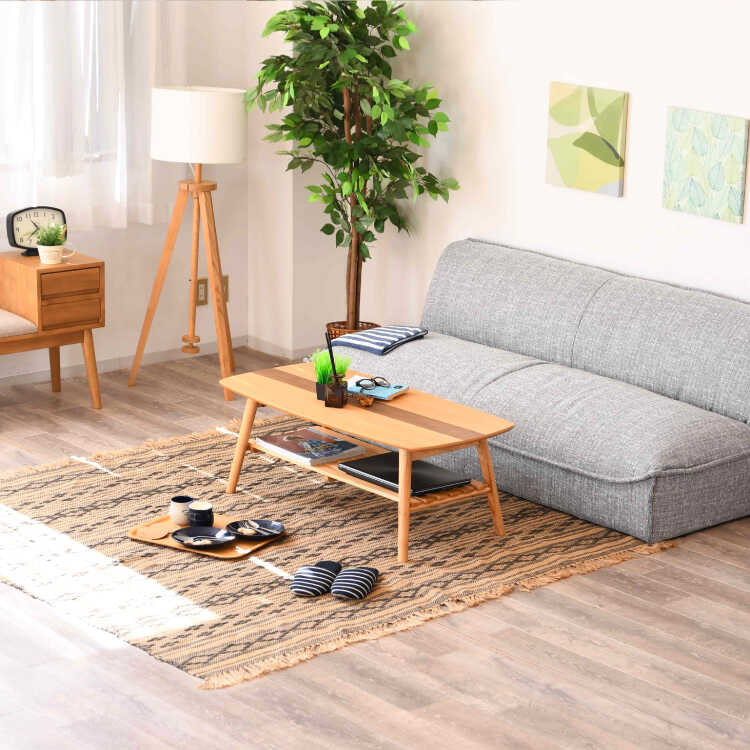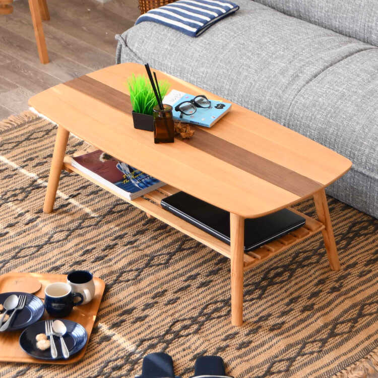 幅105cm・センターラインがお洒落な折りたたみ&棚付きセンターテーブル(天然木オーク製・ナチュラル色)