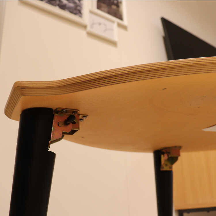 天板の側面は巻いて張らずに、積層の断面をそのまま見せ、下方は内側に向かってエッジを効かせた構造。