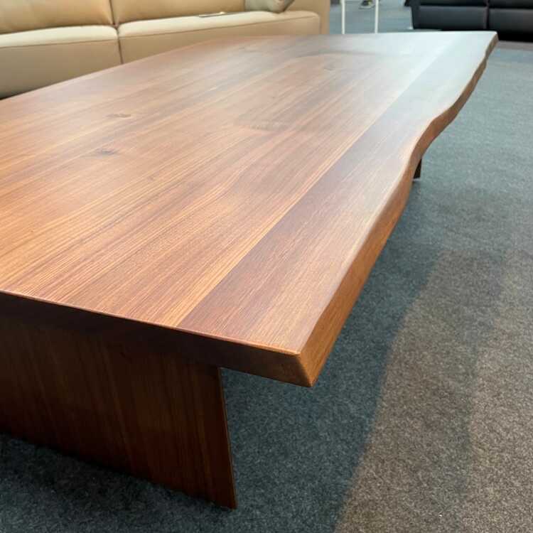 高級木材ウォールナットを全身に使った高級仕様で、天板の長辺には天然耳をあしらった贅沢なテーブルです。