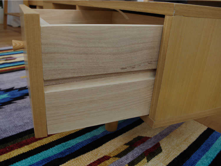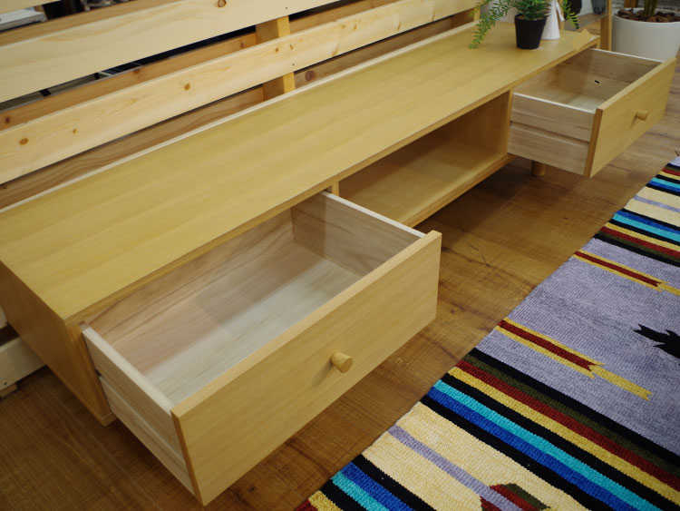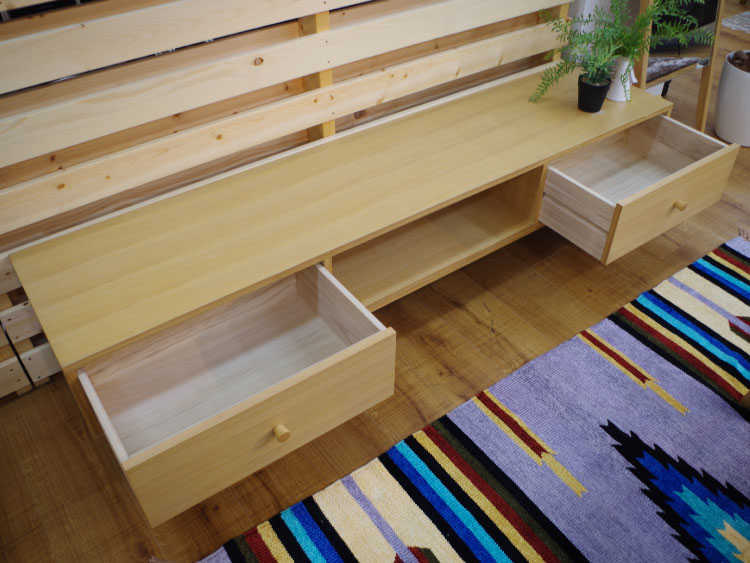 収納スペースはサイドの引出し2杯と中央部のオープン収納を設けています。
