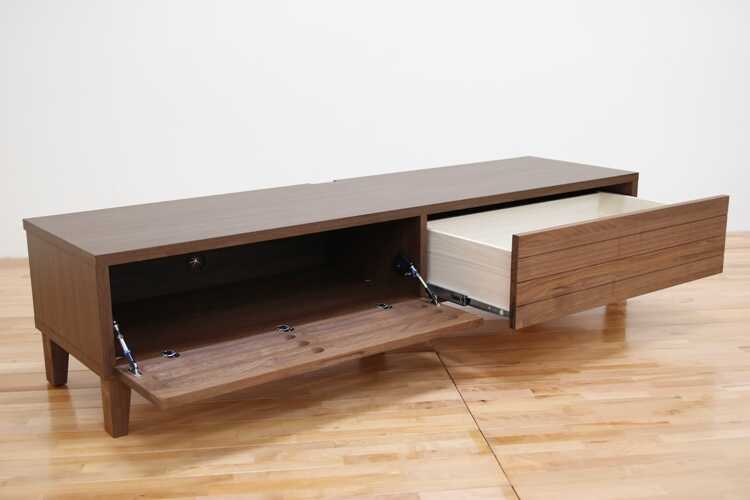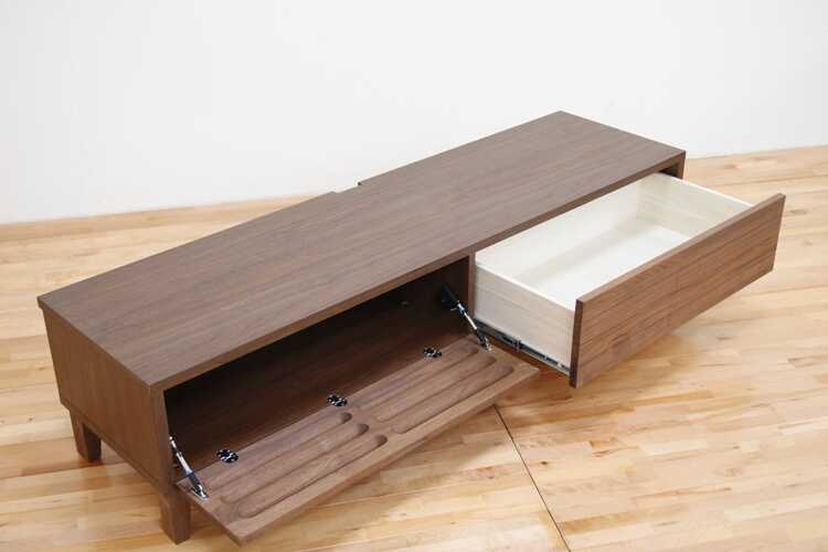 日本製ハイグレードTVボードの引出しは、中に物を入れた状態でも滑らかな開閉が可能な3段引きレールを採用しています。