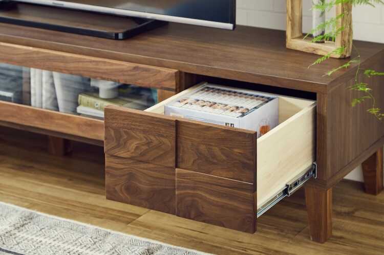 右方には引出し1杯をご用意、DVDやCDなどを美しく収納できるよう寸法にもこだわっています。