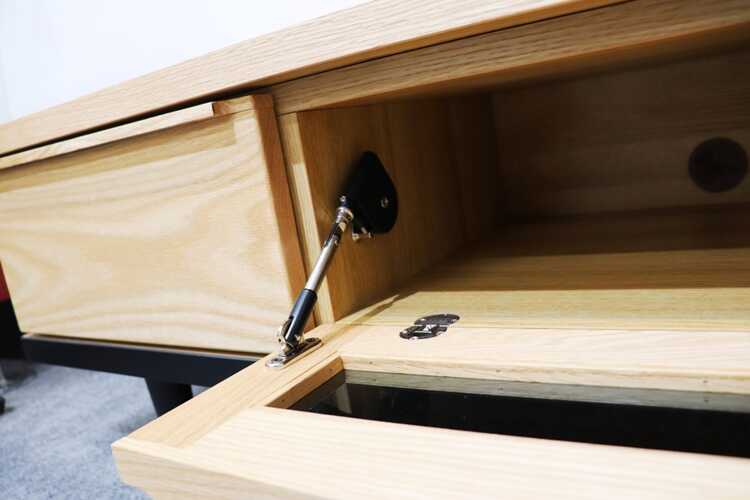 前板にはガラスがはめこまれており、見た目の軽快さだけでなく扉を閉めた状態でもリモコン操作ができる実用性も兼ね備えています。