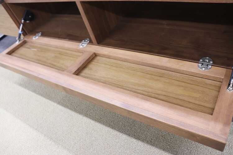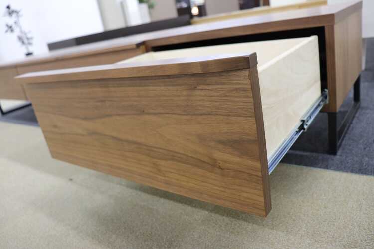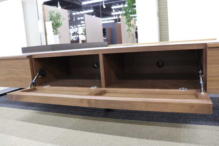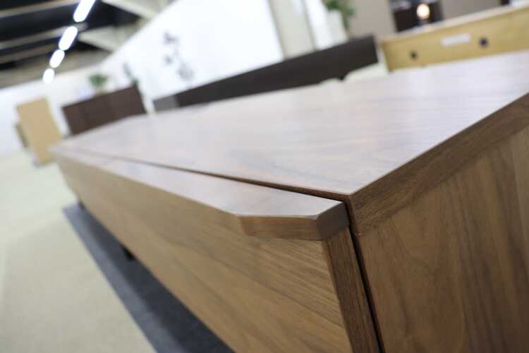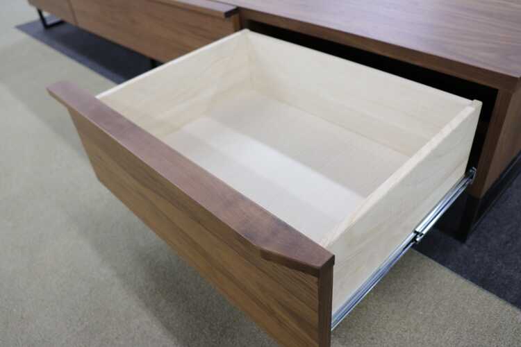 高級木材といわれている天然木ウォールナットを薄くスライスして表面に貼り付けた突板は、前板だけでなく天板にも使用した豪華な仕上がり。