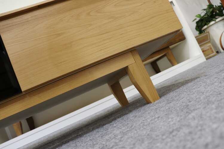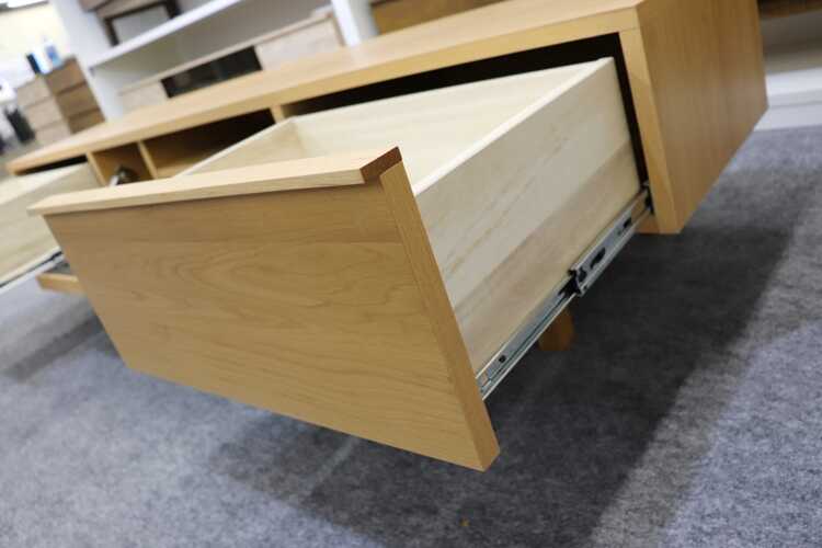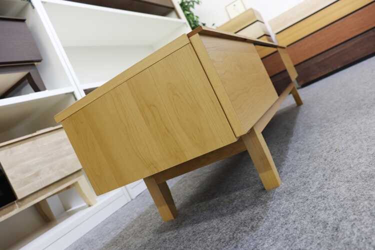 日本製ナチュラル色テレビボードは、高さ41cmとソファに座っても床に座っても使いやすい高さ設計も魅力的。