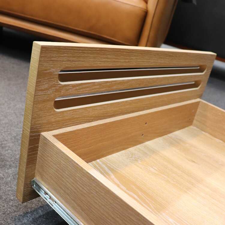 前面の引出し前板と扉には天然木オーク材の突板仕様。